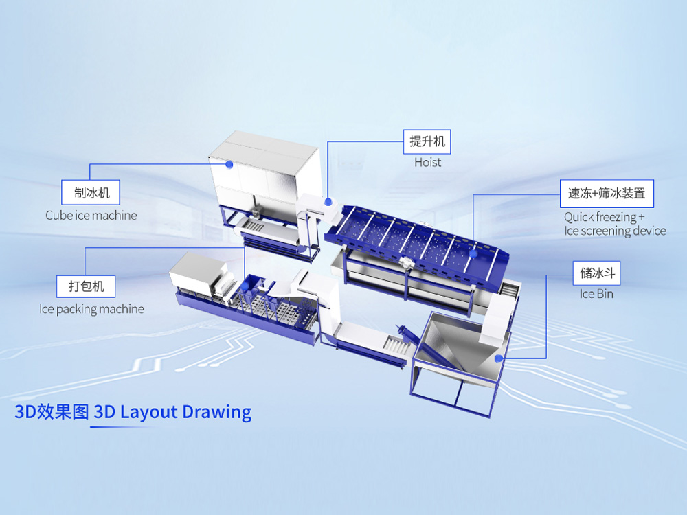 全自動(dòng)化食用冰生產(chǎn)線是一套高度集成的無(wú)人化、自動(dòng)化創(chuàng)新設(shè)備,專為大規(guī)模生產(chǎn)、衛(wèi)生健康、高質(zhì)量的食用方冰廠而設(shè)計(jì)。該系統(tǒng)不僅包括了制冰機(jī),更集成有凈水器,儲(chǔ)冰斗、速凍振動(dòng)篩、傳輸系統(tǒng)、提升機(jī)以及自動(dòng)稱重、打包機(jī),形成了一條從制冰到包裝的全自動(dòng)化生產(chǎn)線。