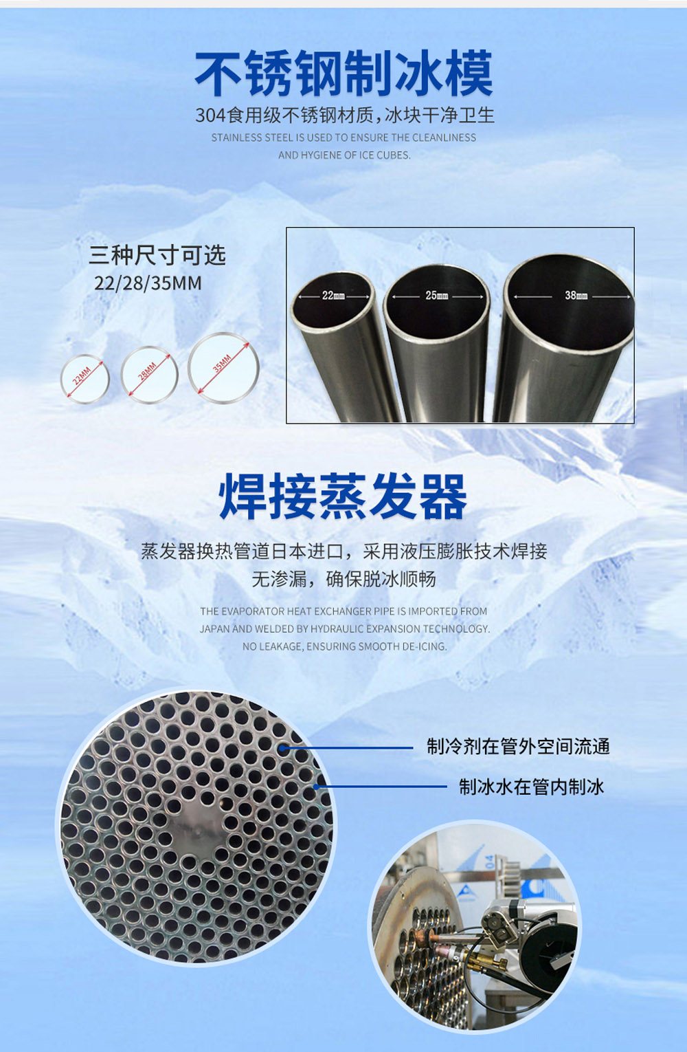 4、蒸發(fā)器換熱管道日本進(jìn)口,采用液壓膨脹技術(shù)焊接, 無滲漏,確保脫冰順暢。